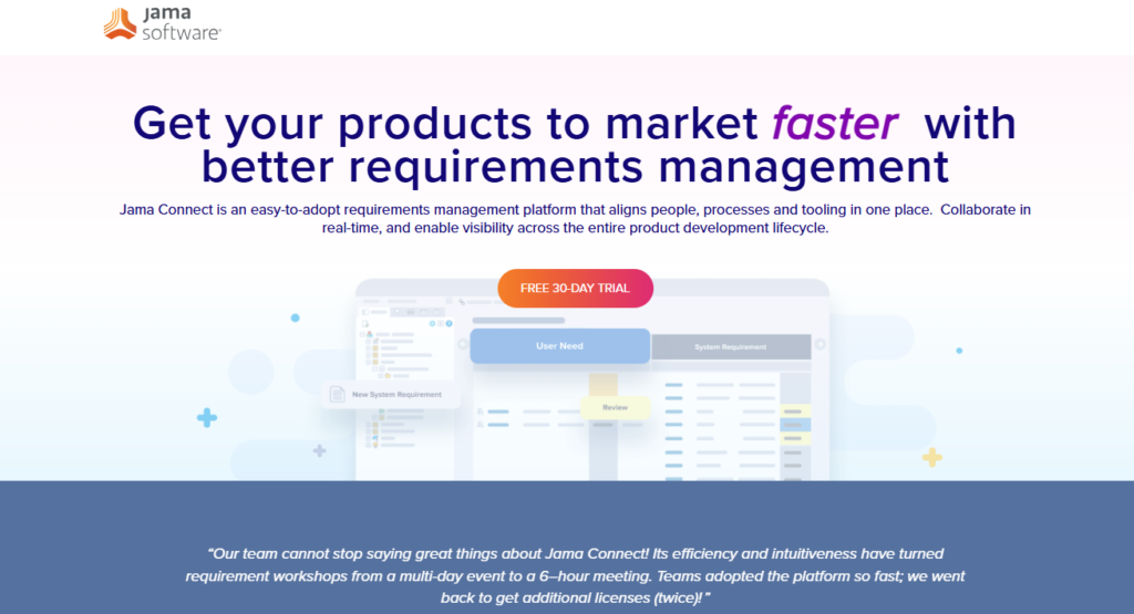 Customer review (G2 reviewer, requirements management user): “The best feature in Jama is the requirement review. Modern and easy-to-use UI.”