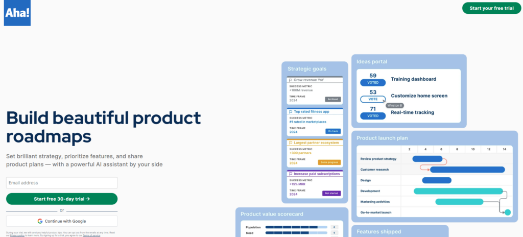 Aha! Roadmaps is a product management platform built around the link between strategy and execution. Product managers use it to define goals and initiatives, prioritize features against those goals, build visual roadmaps for stakeholder review, and push approved features into delivery tools through bidirectional integrations.