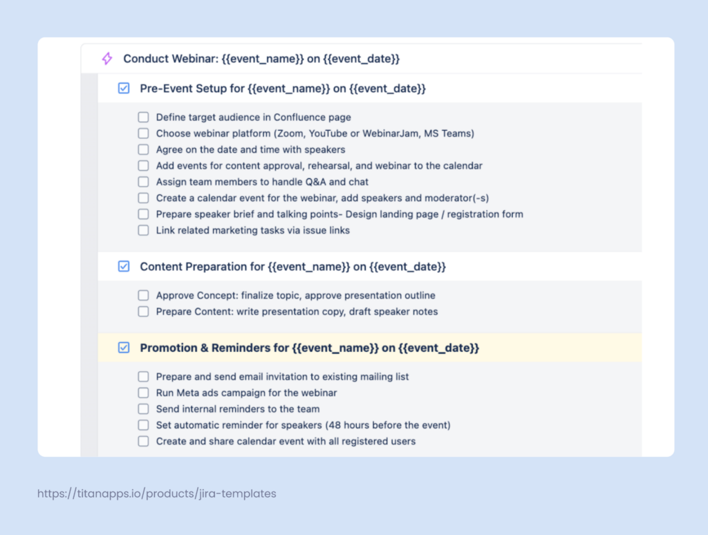 Here’s an example of an Online event planning template prepared with Smart Templates for Jira:
