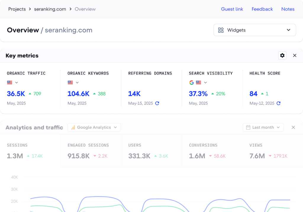 Centralized dashboards based on SEO tool data from SE Ranking help teams track key metrics such as website performance, technical health, and content quality. This makes it easier to monitor progress.
