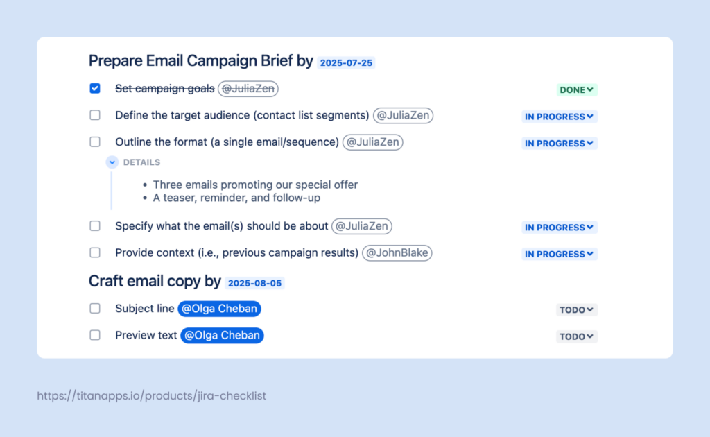 Checklists turn complex marketing tasks into clear, step-by-step action plans. What’s important, they live directly inside Jira issues (work items), exactly where work happens.