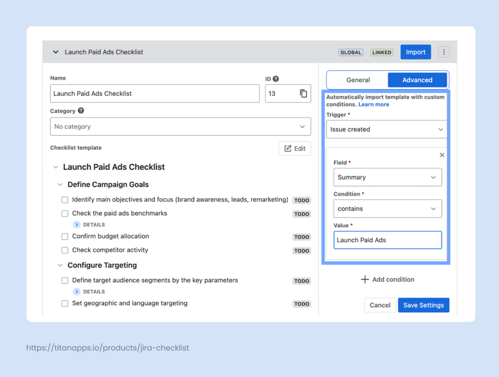 With Smart Checklist for Jira, checklists can be added automatically based on work item type, workflow status, or other conditions. For example, here we have a Launch Paid Ads template, and we set up an automation rule. It will add this checklist to every new work item that has the words “Launch Paid Ads” in its summary: